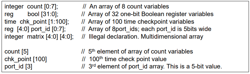Verilog는 reg, integer, time, real, realtime그리고 벡터 레지스터 데이터형의 배열을 제공한다. 다차원 배열은 어떠한 차원으로도 선언된다. 넷의 배열 또한 생성된 인스턴스의 연결포트에 사용될 수 있다.