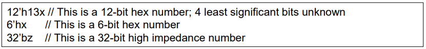 Verilog는 알 수 없는 값(unknown)과 하이 임피던스(high impedance)값을 나타내는 기호를 제공한다.