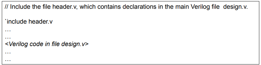 'include 지시어는 다른 Verilog 파일에 있는 Verilog 소스 파일의 전체 내용을 컴파일하는 동안 포함하게 해준다. C의 #include와 유사하다.