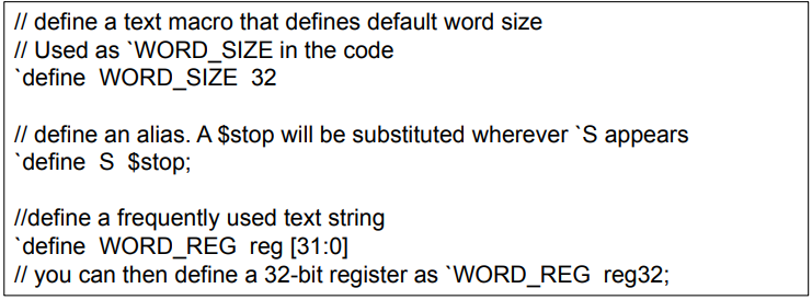 'define 지시어는 Verilog에서 텍스트 매크로를 정의하는데 사용한다. C에서 #define과 유사하다.