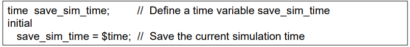 Verilog 시뮬레이션은 시뮬레이션 시간을 고려하면서 동작한다. 시뮬레이션 시간을 지정하기 위해 Verilog는 시간 레지스터 데이터형을 사용한다. 시간값은 키워드 time에 의해 선언된다.