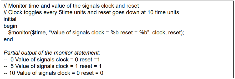 $monitor태스크로 신호의 값이 변할 때마다 그 신호를 출력할 수 있다. 변수 또는 파라미터에 지정된 신호의 값을 계속 모니터링하고, 리스트의 어느 한 변수나 신호가 변할 때마다 모든 파라미터를 출력한다.