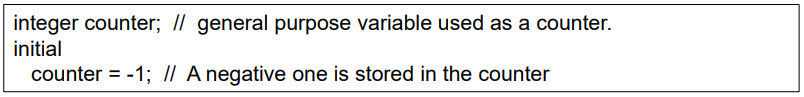 키워드 integer에 의해 선언되며, 양을 다루기 위한 일반적인 범용 레지스터 데이터형이다. 변수보단 카운트 같은 목적을 위해 정수를 사용하는 것이 편한다. reg로 선언되는 레지스터는 음수 사용이 불가능하지만 inteager는 가능하다.