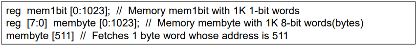 Verilog에서 메모리는 단순히 레지스터의 배열로 만들어진다. 배열의 각 원소는 워드이다. 각 워드는 1또는 여러 비트가 될 수 있다. 대부분 배열의 사용은 메모리에서 사용된다.