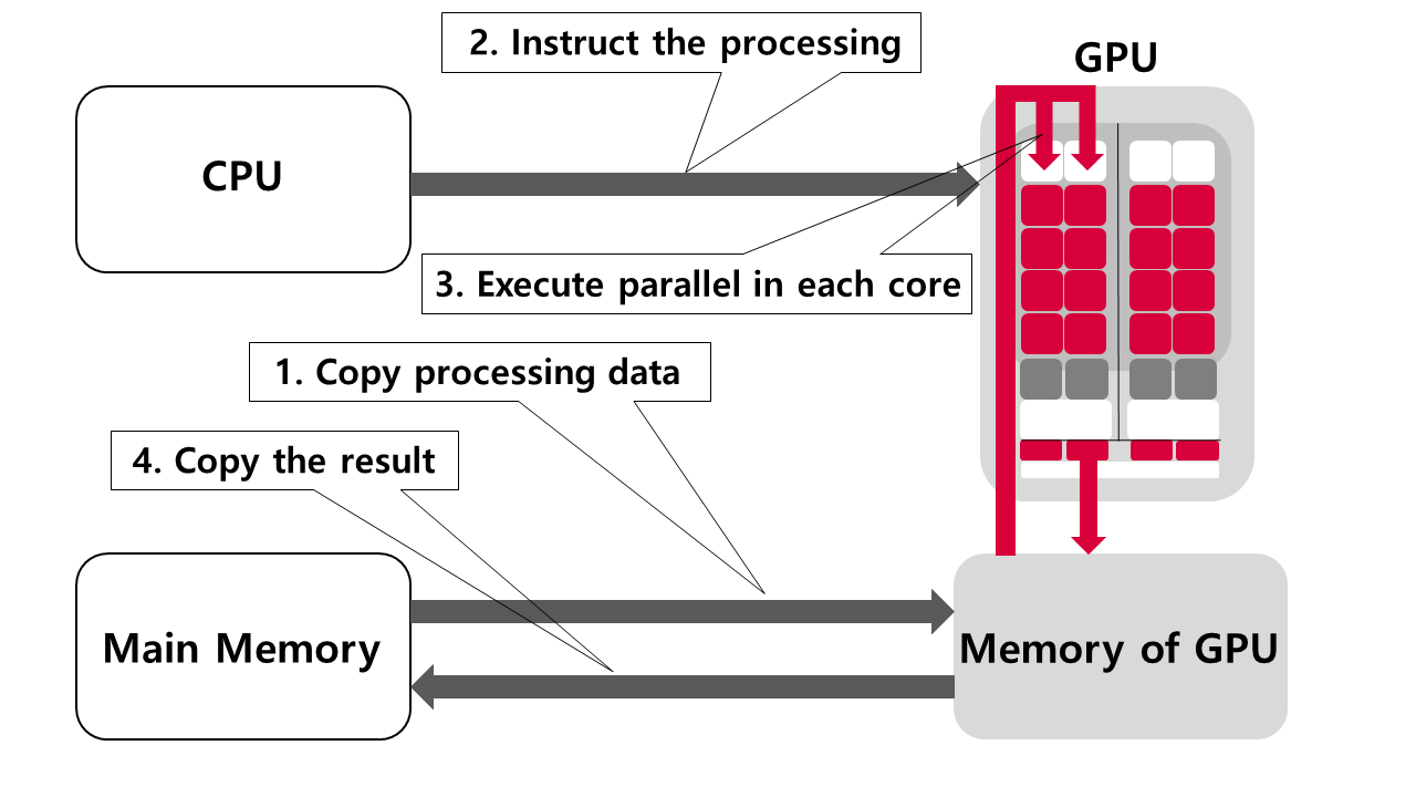 CPU와 GPU는 사용목적과 배경에 따라 서로 다르게 발전했다. GPU는 CPU보다 훨씬 많은 양의 ALU를 보유하고 있어 병렬연산에 용이하지만, 현재까지 CPU(host)없이 GPU는 구동할 수 없다. GPU를 구동하기위해 host는 연산과 데이터를 GPU에 옮겨야하며, GPU의 연산 결과는 추후 host로 리턴해야된다. 이를 위해 CUDA program이 필요한다.