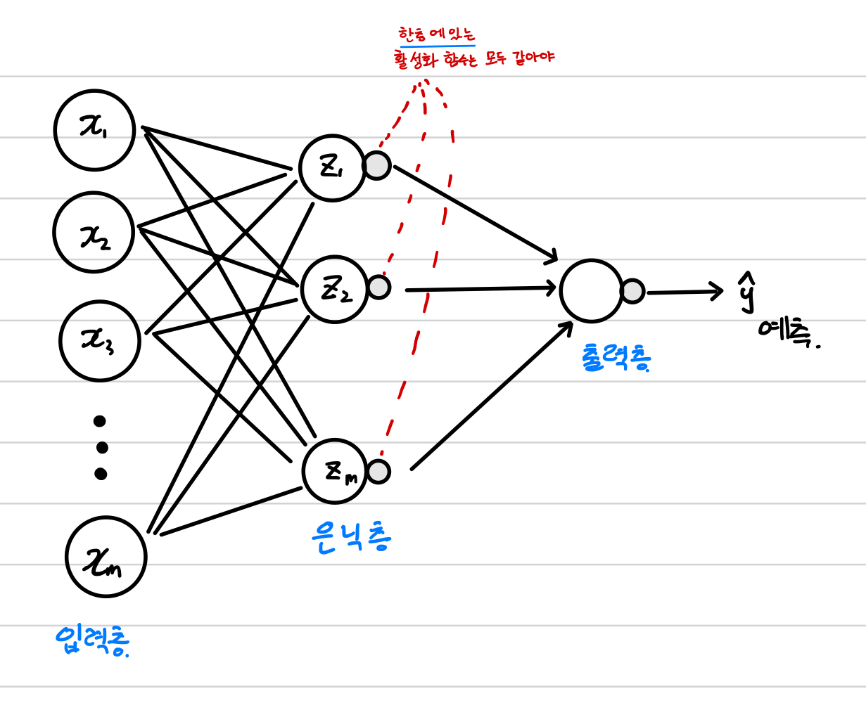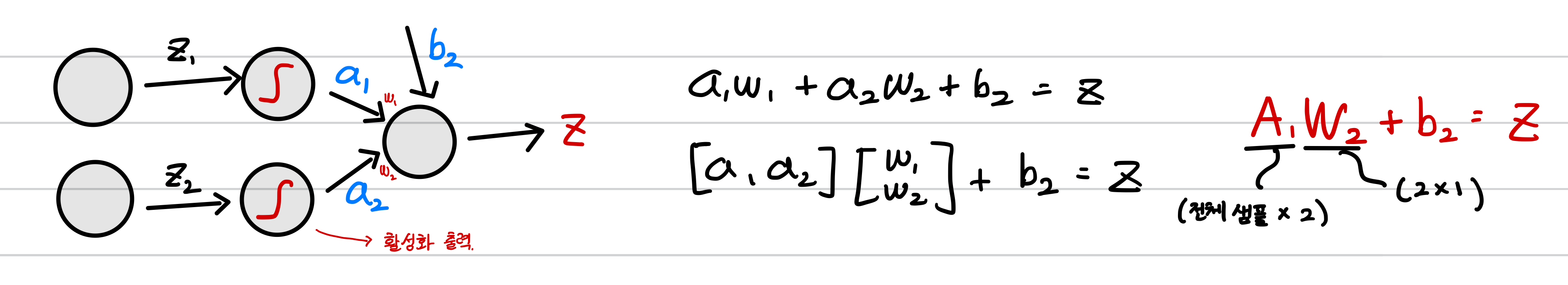 또한 각 뉴런에 대해 도출된 z를 활성화 함수에 통과 시키고 각각의 가중치를 부여해 하나의 출력으로 나타내야 합니다.