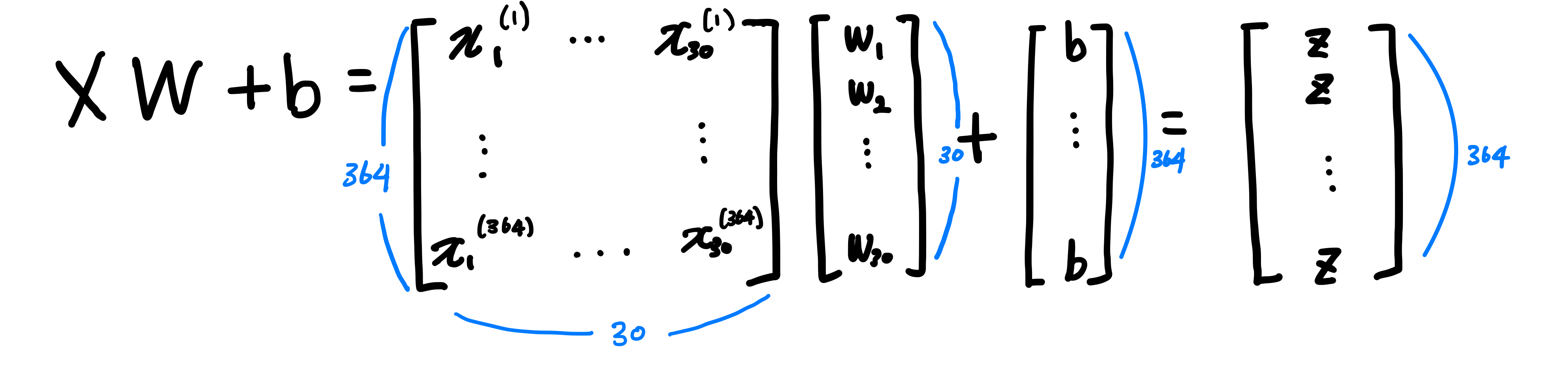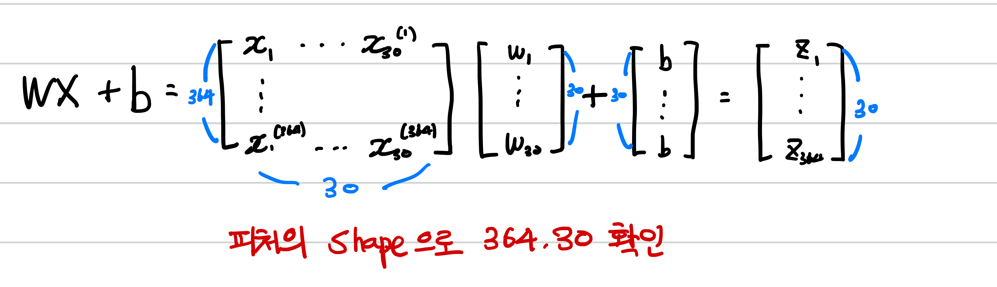 이제 좀더 나아가 전체 샘플에 대한 가중치 곱의 합을 행렬곱셈으로 구해봅시다.