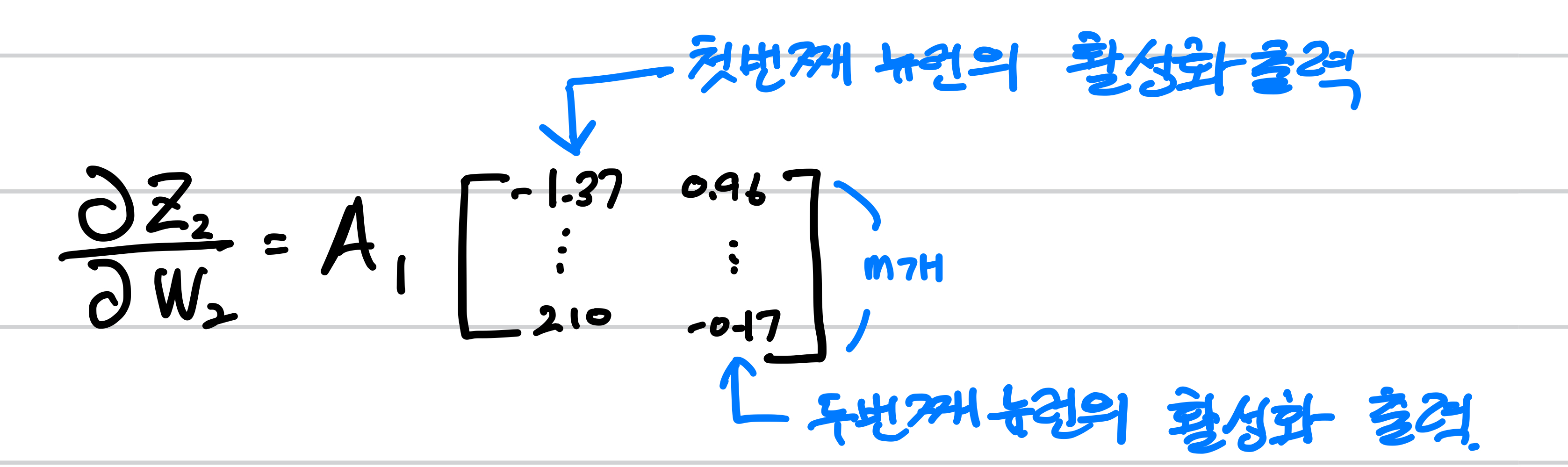 A1은 첫번째 가중치행렬 W1 과 입력 데이터 X를 입력 받고 이를 활성화 함수를 통과시킨 값입니다. 즉 , 데이터의 샘플의 크기와 뉴런의 갯수가 이 행렬의 크기가 되는 겁니다. (m,2)