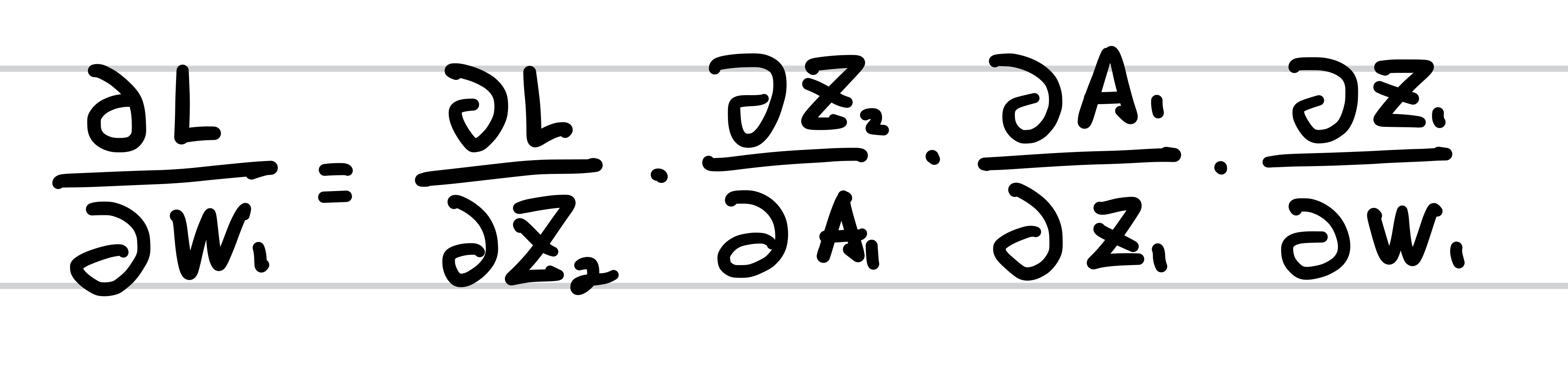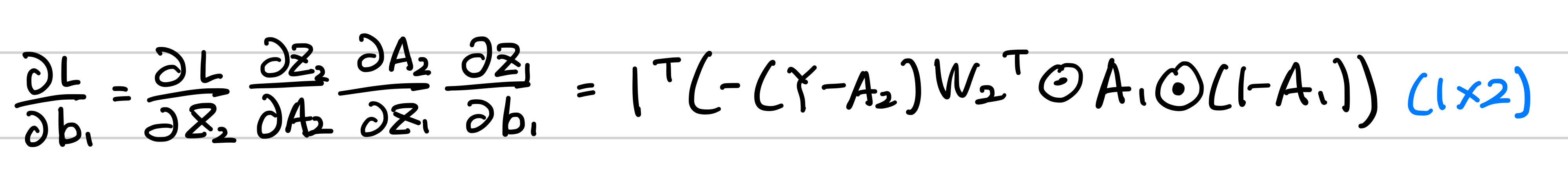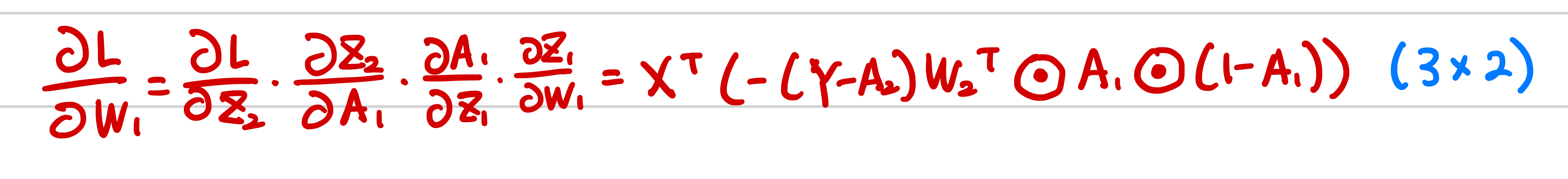 가중치 W1에 대하여 손실 함수를 미분은 다음과 같은 연쇄법칙으로 나타낼 수 있습니다.