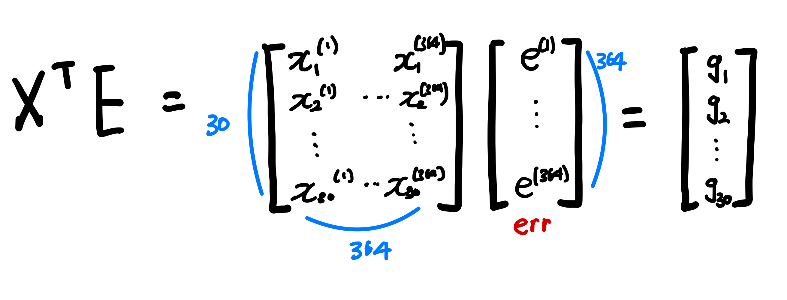 X.T는 계산을 위해 X를 전치한 것이고 E는 오차를 나타낸 행렬입니다.