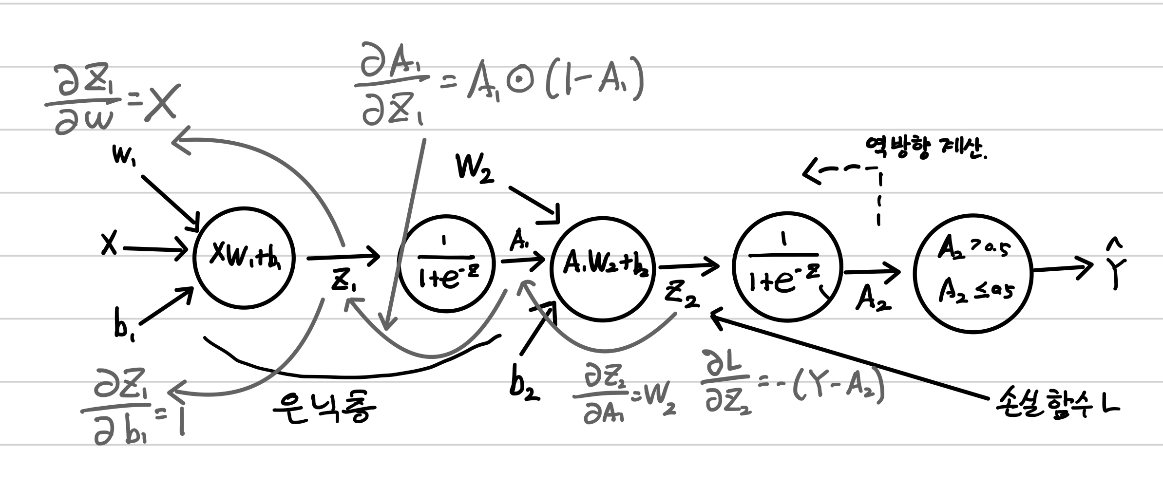 다음은 신경망에 절편에 대한 손실 함수의 미분까지 표시한 것입니다.