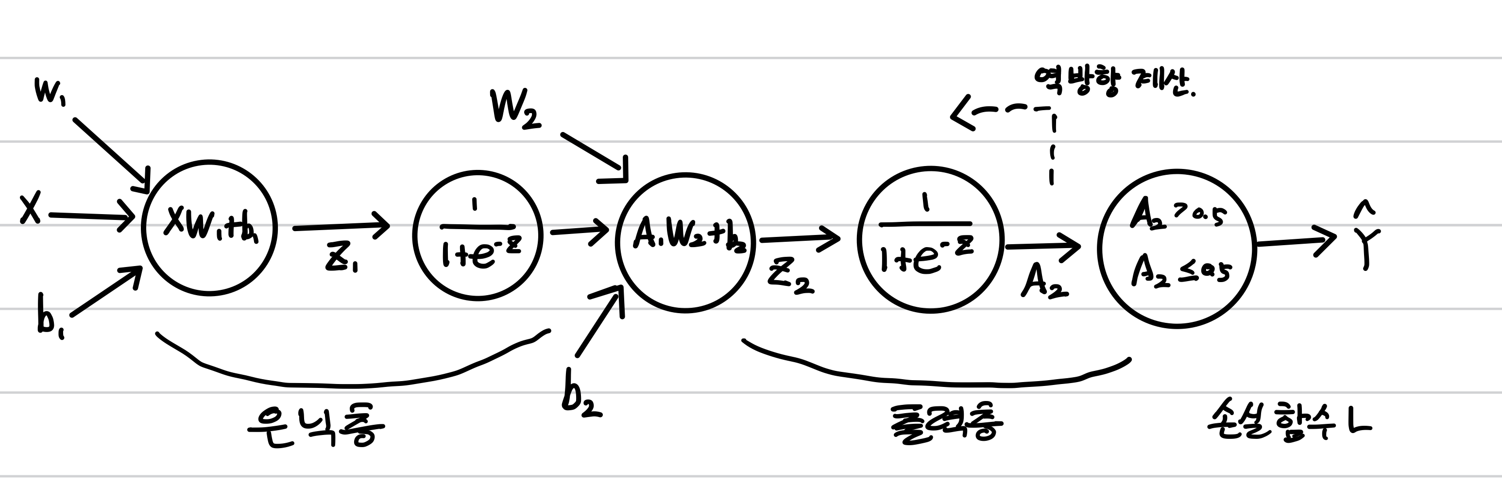 2개의 층을가진 신경망은 입력행렬 X, 첫번째 층의 가중치 행렬 W1과 절편 b1 첫번째 층의 출력 Z1 첫번째층의 활성화 출력 A1, 두번째 층의 가중치 행렬 W2 절편, 두번째 층의 출력 Z2로 나타낼 수 있다.
