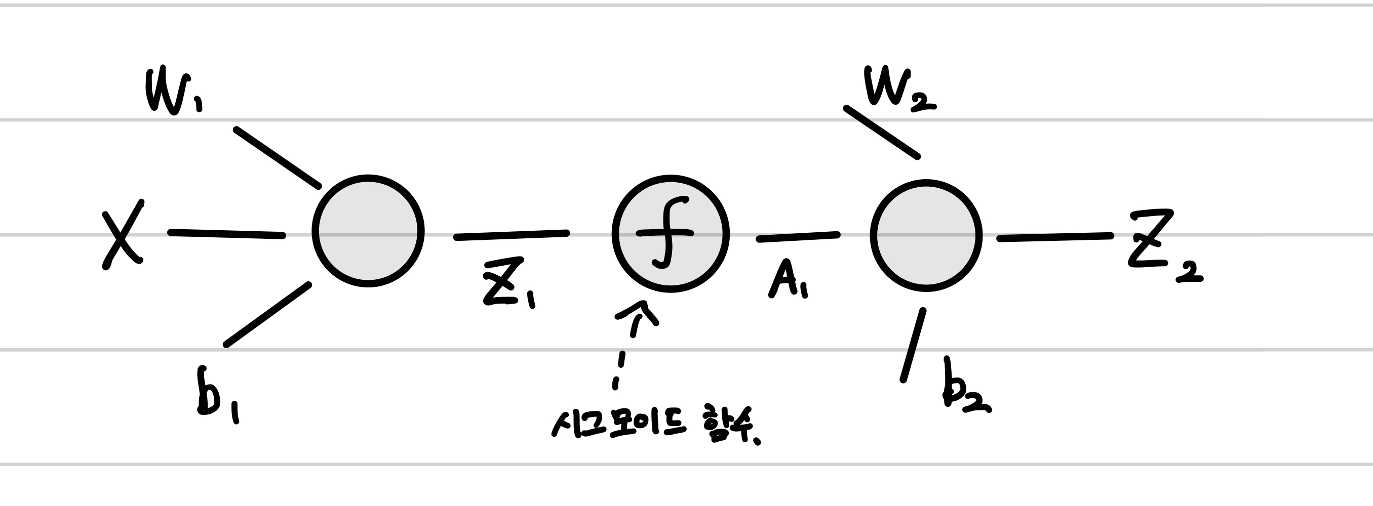 2개의 층을가진 신경망은 입력행렬 X, 첫번째 층의 가중치 행렬 W1과 절편 b1 첫번째 층의 출력 Z1 첫번째층의 활성화 출력 A1, 두번째 층의 가중치 행렬 W2 절편, 두번째 층의 출력 Z2로 나타낼 수 있다.