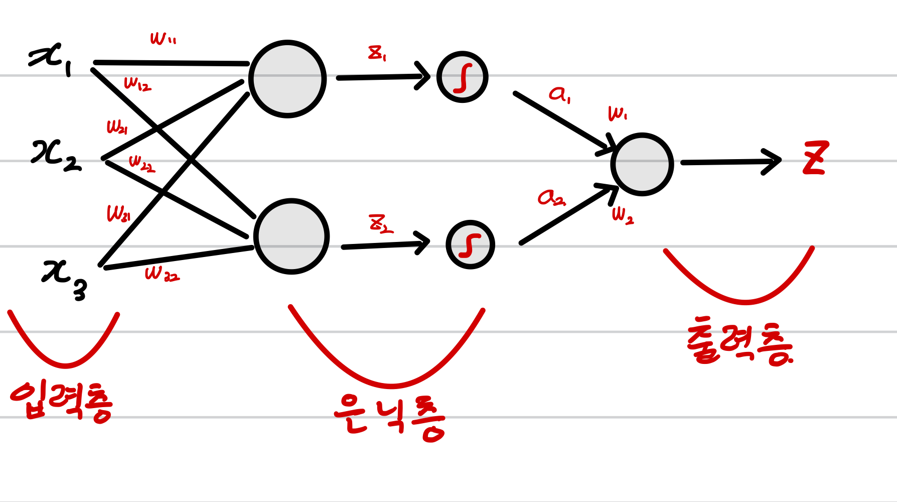 또한 각 뉴런에 대해 도출된 z를 활성화 함수에 통과 시키고 각각의 가중치를 부여해 하나의 출력으로 나타내야 합니다.