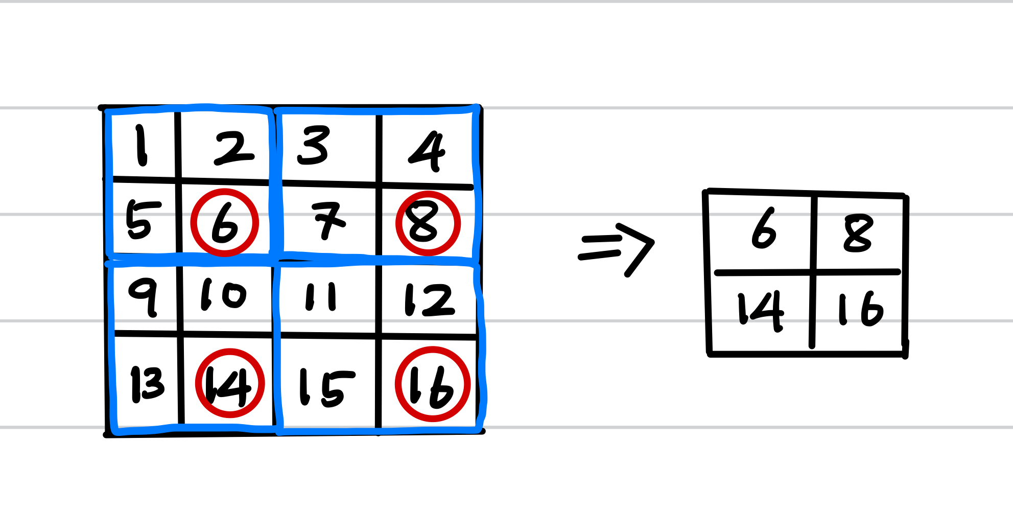 앞에서 풀링은 최댓값을 고르거나 평균값을 계산하는 방법이 있었습니다. 여기서 최댓값을 고르는 방식을 맥스풀링방식이라 합니다.