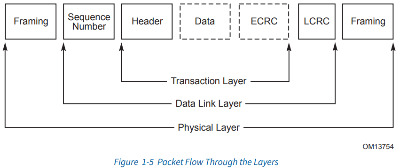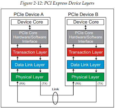 PCIe architecture는 계층적 구조로 되어 있으며, 이는 각 계층이 특정 기능을 수행하도록 설계되어 있습니다. 주요 계층은 transaction layer, data link layer, (logical/electrical) physical layer이며, 각 계층의 역할은 다음과 같습니다.