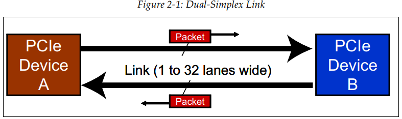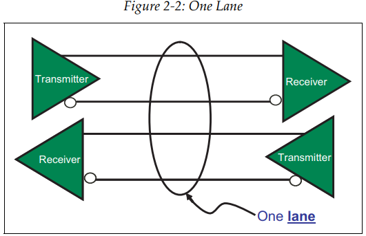 PCIe는 PCIe device 간에 연결해 주는 인터페이스이기에, PCIe link에 대해 먼저 알아봅시다. PCIe는 point-to-point serial bus이며, link는 하나 이상의 lane으로 구성이 됩니다. 또한 PCIe lane은 동시에 양방향 송수신이 가능한 "duplex" 연결이므로 하나의 lane은 Tx와 Rx 부분의 wire로 구성되어 있습니다. 그래서 하나의 lane은 2개의 wire라고 생각할 수 있지만, PCIe는 differential signaling을 사용하기 때문에 Tx와 Rx는 각각 2개의 wire를 가지게 됩니다. 즉, 하나의 PCIe lane은 총 4개의 wire로 구성됩니다.