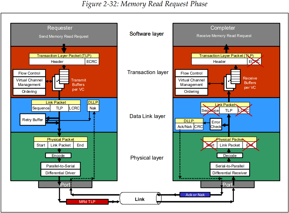 Device B의 physical lyaer는 device A에서 전송받은 packet을 다시 seral to parallel 변환을 하고, 디코딩을 진행한 후, logical phy에서 붙인 framing symbol을 제거한 뒤, data link layer로 전송합니다. data link layer에서는 CRC 체크와 예상되는 sequence number와 실제 들어온 sequence number를 비교해 이상이 없는지 확인합니다. 만약 이상이 있으면, device B는 device A에게 Nak DLLP를 전송합니다. 이상이 없으면 data link layer에서 LCRC와 sequence number를 제거한 뒤, transaction layer로 전송합니다. transaction layer에서 ECRC check를 한 뒤, 문제가 없으면 전송받은 packet을 확인한 뒤, 알맞은 동작을 수행하게 됩니다.