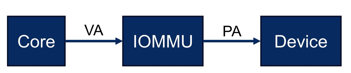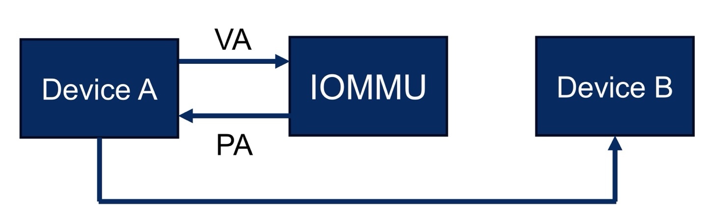 일단 기본적으로 집고 넘어가야 되는 부분은 PCIe bus를 physical address로 움직인다는 것입니다. 예를 들어, Host CPU/Core가 PCIe device에 접근할 때는 왼쪽 그림과 같이 실행될 것입니다. 이 과정은 ATS와 무관합니다. 하지만 Device Core가 Host CPU/Core 또는 다른 PCIe device에 접근한다고 가정해 봅시다. device core A가 VA를 통해 device B에 접근하는데, PCIe bus는 PA이기 때문에, address translation이 필요합니다. 즉, PTE를 얻기 위해 page table에 접근해야 하는데 이때 ATS가 사용됩니다. device A가 page table에 접근하는 것이 아닌 IOMMU에 ATS request를 보내면, IOMMU가 ATS response로 변환된 주소와 permission을 줍니다.