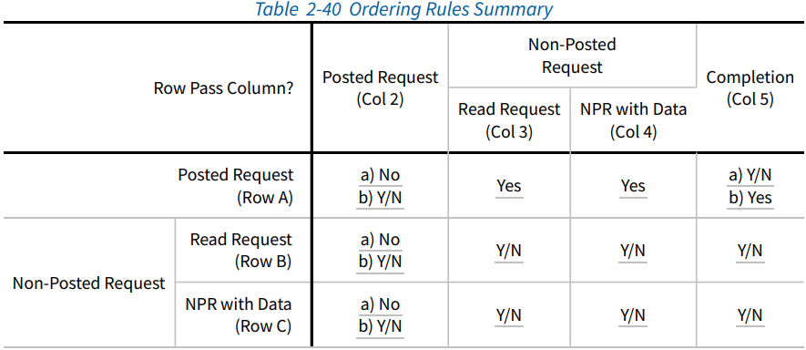 PCIe는 동일한 traffic class(TC) 할당을 받은 transaction의 strong order를 요구합니다. 동일한 TC값을 할당받은 transaction은 주어진 VC에 매핑되므로, 각 VC내의 트랜잭션에 대해 동일한 규칙이 적용됩니다. 반면에 같은 VC일지라도 다른 TC들 간에는 ordering 관계가 존재하지 않습니다.