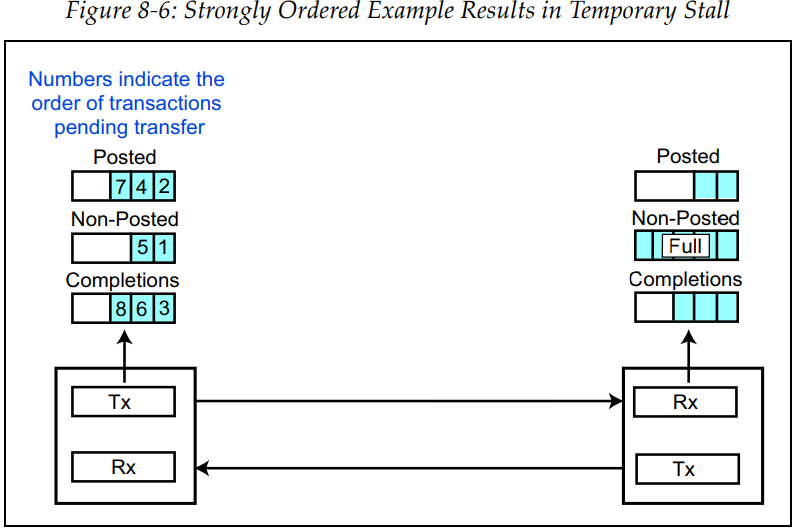 위 그림을 통해 좀 더 쉽게 알아봅시다. 현재 송신 측의 Non-posted 유형의 transaction이 첫 번째 transaction인 상황에서 수신측의 Non-posted 수신 버퍼가 꽉 차서(즉, non-posted에 대한 credit이 없을 때) 전송이 될 수 없을 때 strong ordering인 경우 뒤에 오는 모든 transaction이 blocking 되어 시스템이 stall 되는 일이 발생할 것입니다.