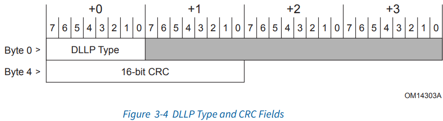DLLP(Data Link Layer Packet)은 특히 data link layer에서 사용되는 작은 크기를 가지는 packet 유형입니다. DLLP는 큰 data block을 전송하는 TLP와는 달리, link의 상태 관리, 에러 및 flow control 업데이트와 같은 작업을 수행하기 위해 설계되었습니다. 다음 예시 중 왼쪽은 DLLP의 공통부분에 대한 구조를 나타내고 있으며, 오른쪽은 Ack/Nak 관련 DLLP의 경우에 대한 packet 구조를 나타내고 있습니다.