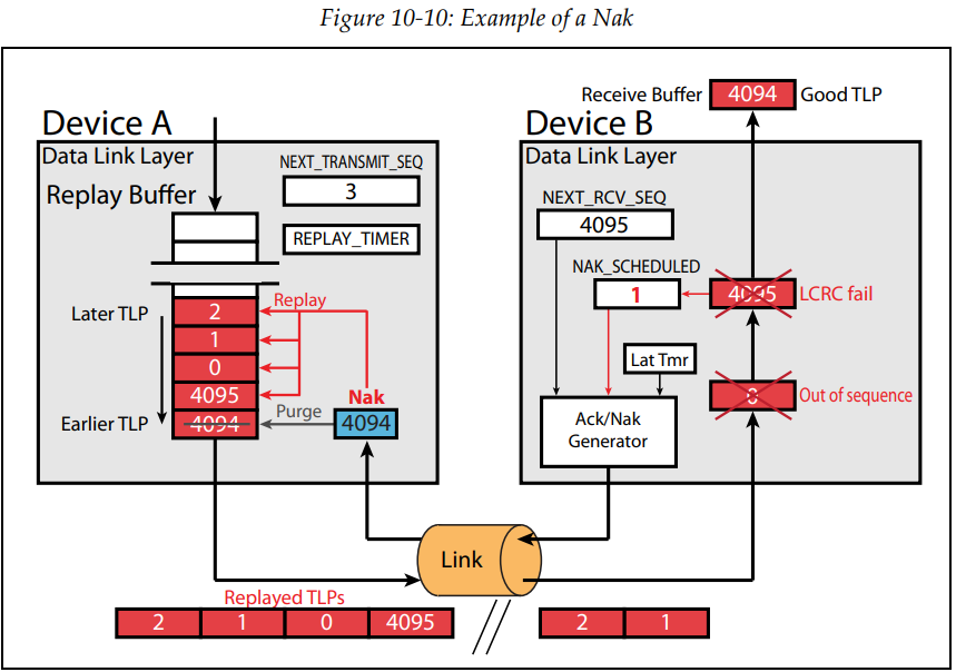 하지만 어떠한 이유로 예를 들어 Ack/Nak가 버려졌거나 늦게온다면, REPLAY_TIMER가 reset 되지 않을 것이며 결국 TIMEOUT이 발생할 것입니다. TIMEOUT이 발생한다면 retry buffer에 있는 모드 packet들이 재전송됩니다.