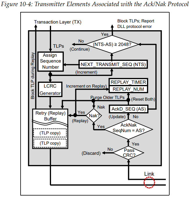 만약 AS값이 DLLP의 sequence num와 같다고 해봅시다. 즉, progress가 진행되지 않고 있지 않고, 그 DLLP가 Nak이라면 retry buffer의 모든 TLP가 마찬가지로 재전송되며, REPLAY_NUM을 1 증가시킵니다. REPLAY_NUM은 Nak 또는 REPLAY_TIMER의 TIMEOUT 횟수를 추적하는 2bit 카운터입니다. REPLAY_NUM 카운터가 11b에서 00b로 넘어가면(즉, 동일한 TLP 전송 시도가 4번 실패했음을 의미), data link layer는 자동으로 physical layer에 link를 retraining 하도록 강제합니다. (LTSSM이 recovery 상태로 전환)