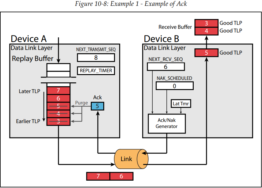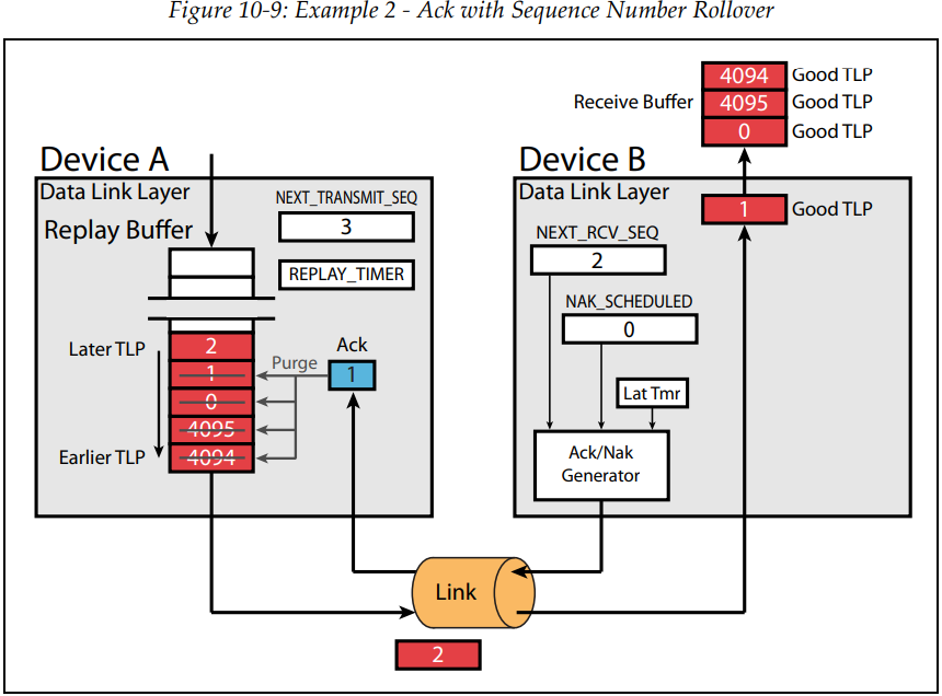 - 수신 측에서는 중복된 TLP는 필요하지 않으므로 폐기합니다. 또한 NRS는 증가하지 않습니다. 다만 last good TLP (NRS-1) 값을 sequence number로 할당한 Ack 유형의 DLLP를 송신 측에 전송합니다. 마찬가지로 AckNak Latency timer가 만료 시 스케줄 된 Ack DLLP가 전송됩니다.