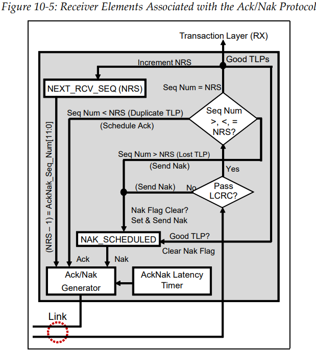 Ack/Nak Protocol을 구현하기 위해 수신측에서 어떠한 일들이 벌어지는지 알아봅시다. 먼저 Tx로부터 받은 TLP를 CRC checking을 합니다. 만약 CRC check에서 실패한다면 해당 TLP를 버리고, NAK_SCHEDULED 플래그를 띄웁니다. 그다음 expected sequence number를 뜻하는 NEXT_RCV_SEQ(NRS)에서 1을 뺀 값을 sequence number로 DLLP에 할당합니다. 즉, 마지막으로 Ack 된 sequence number를 의미합니다. 예를 들어 sequence number 10번을 기다리고 있었는데 에러가 났다면, 마지막으로 Ack 된 sequence number는 9번이 될 것입니다. 참고로 전달받은 TLP에도 sequence number가 있는데 이를 사용하지 않는 이유는 CRC 에러가 발생했기 때문에 전달받은 TLP는 더 이상 신뢰할 수 없기 때문입니다.