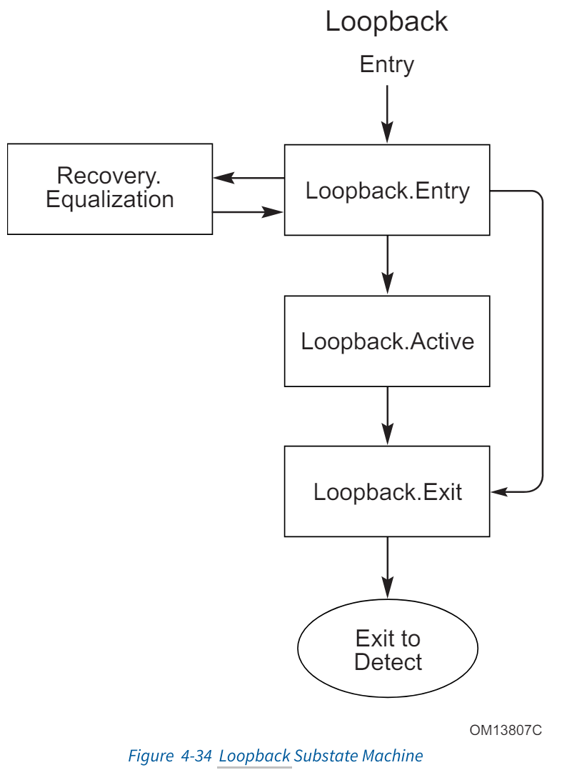 주로 link의 test관련해서 사용되는 상태입니다. Configuration 또는 Recovery 상태에서 진입하며 주요 동작은 LinkUp bit를 0으로 설정하고, Loopback bit를 설정한 TS1 OS를 송수신합니다. 그 후, 상태를 Loopback.Active로 전환하며, 이 상태에서 4개 연속된 EIOS를 수신하거나 상위 계층의 지시를 따라 Loopback.Exit로 전환됩니다.