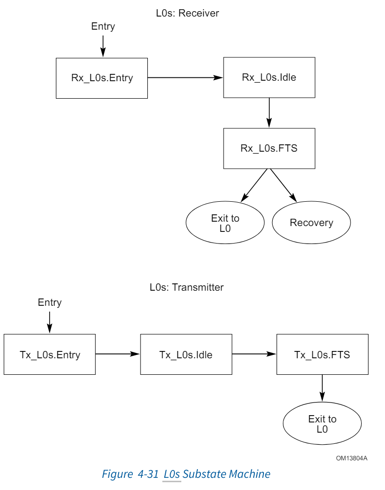 PCIe link의 전력 절감을 위해 전환하는 모드로, 빠른 L0 복귀가 가능하다는 장점이 있습니다. 특정 상태를 거칠 필요없이 특정 숫자의 FTS ordered set을 전송한 뒤, L0상태로 복귀할 수 있습니다. 이때 보내야할 FTS OS 수는 전에 link training 할때 TS OS의 FTS# 필드에 기록한 값입니다.