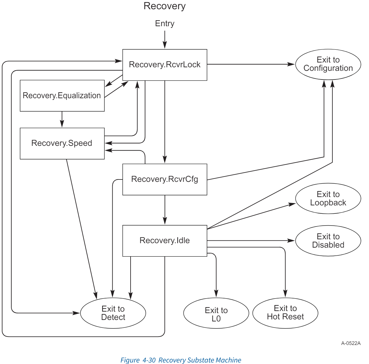 여러가지 이유로 L0 상태에서 Recovery 상태로 전환될 수 있습니다. 대표적으로 speed 변경, link width 변경, link error 복구등이 있습니다. 앞서 PCIe data link layer에서 ACK/NAK 프로토콜을 설명할때, 특정 TIMEOUT이 발생할 경우 link의 상태를 Recovery상태로 바꾼다고 했습니다. PCIe의 link 오류는 대부분 단발적인 경우가 많은데 이렇게 연속적으로 에러가 발생한다는 것은 link 자체에 문제가 있기 때문에 PCIe의 link 상태를 recovery 상태를 바꿔 re-training을 시키는 것입니다. 또 다른 대표적인 상황은 link의 속도 변경입니다. 앞서 말했듯이 PCIe 링크가 32.0 GT/s로 지원하더라도 한 번에 32.0GT/s로 link가 동작할 수는 없습니다. link training 초기에는 2.5GT/s 속도로 동작하다가 recovery 상태로 전환후, 원하는 속도로 변경해야되기 때문입니다.