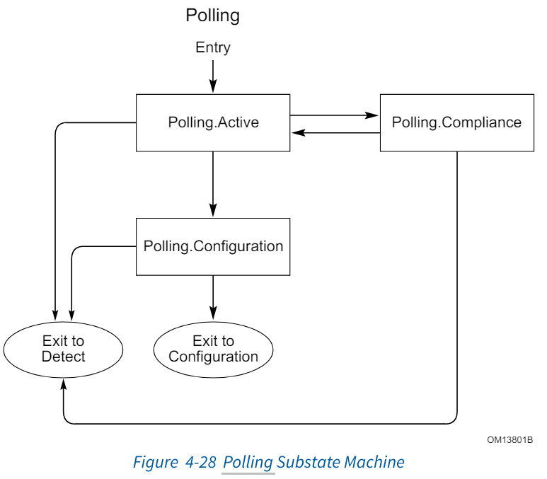 Polling state의 목표는 link의 speed를 2.5GT/s로 설정하며, bit/symbol lock을 확보하는 데 있습니다. 이는 link를 training하는 과정에 필수적인데, 예를 들어 PCIe 5.0을 지원하는 link라고 해도, 한 번에 32.0GT/s의 속도로 설정할 수 없으며, 처음에는 2.5GT/s로 설정한 다음, recovery.speed 상태에서 지원하는 속도로 전환하기 때문입니다. 또한 "lock"을 달성하는 것도 굉장히 중요한데, lock을 달성했다는 것은 쉽게 말해서 링크 파트너와 대화를 할 수 있다는 뜻입니다. bit lock은 1과 0을 판별할 수 있다는 것, symbol lock은 1byte symbol을 구분할 수 있다는 것입니다. 이렇게 lock을 달성함으로써 링크 파트너간 TLP와 DLLP와 같은 packet을 주고 받을 수 있습니다.