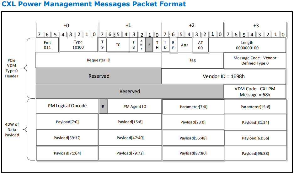 - 4 DW 데이터 페이로드: CXL PM Logical Opcode(e.g., PMREQ, GPF)와 CXL PM 메시지와 관련된 기타 정보를 포함합니다.