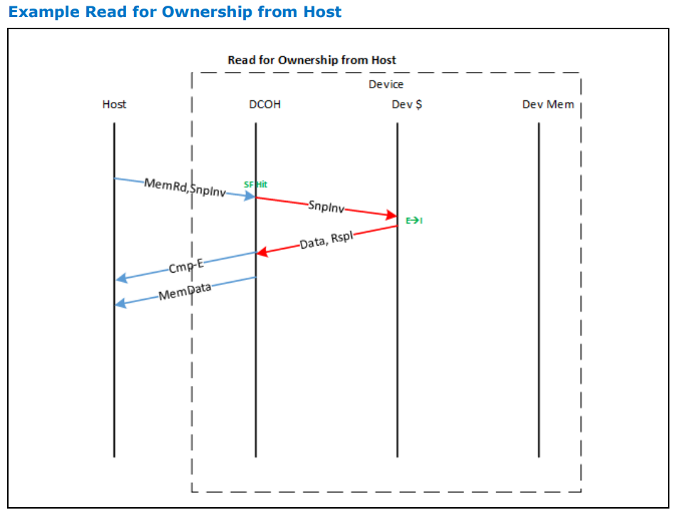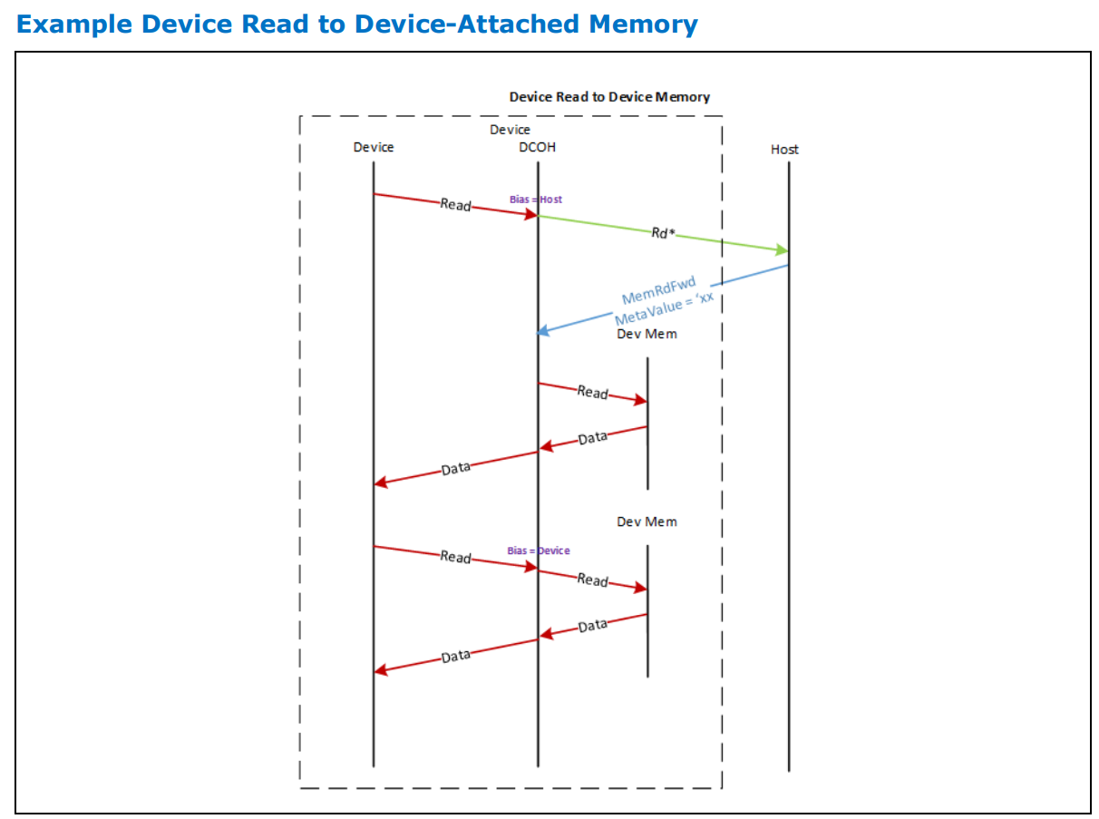 - Device Bias: 장치가 Device bias 상태의 device-attached memory에서 라인을 읽는 상황입니다. 이 경우, 장치는 호스트에 요청을 보낼 필요 없이 내부적으로 읽기를 완료할 수 있습니다.