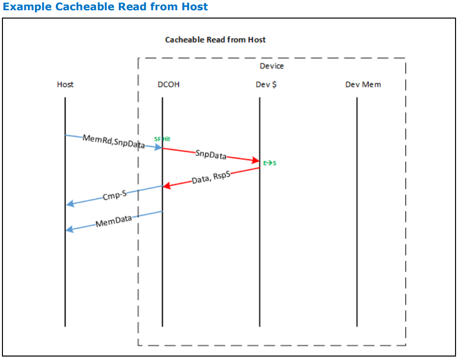 호스트가 캐시 가능한 non-exclusive line의 사본을 요청하는 상황을 고려해봅시다. 요청은 "SnpData" semantics를 사용하여 비독점적 특성을 전달합니다. 이 예에서, 요청은 DCOH(Device Coherency Engine) 내의 snoop 필터에서 히트를 발생시켜 장치 캐시가 snoop됩니다. 장치 캐시는 상태를 Exclusive에서 Shared로 상태 전이를 하고, Shared 데이터 사본을 호스트에 반환합니다. 호스트는 Cmp-S semantics를 통해 라인의 상태를 전달받습니다.
