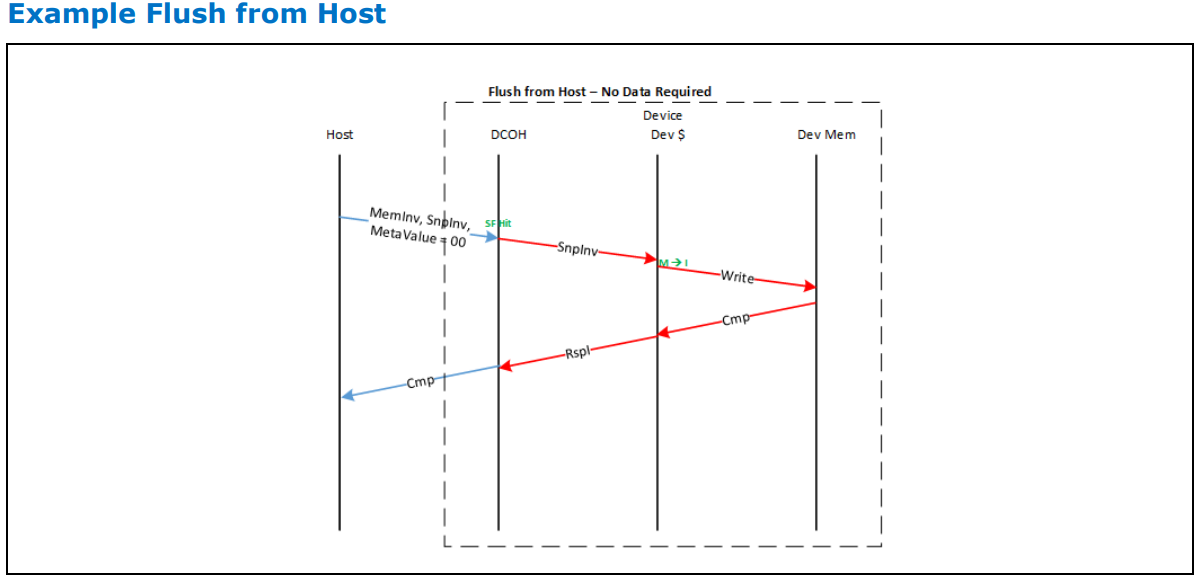 호스트가 모든 캐시, 포함된 장치의 캐시를 장치 메모리로 flush하려는 상황입니다. 이를 위해 MemInv opcode와 MetaValue '00 (Invalid)' 및 SnpInv 명령을 사용합니다. 장치는 캐시를 flush하고 Cmp semantics를 통해 호스트에 이를 전달합니다.