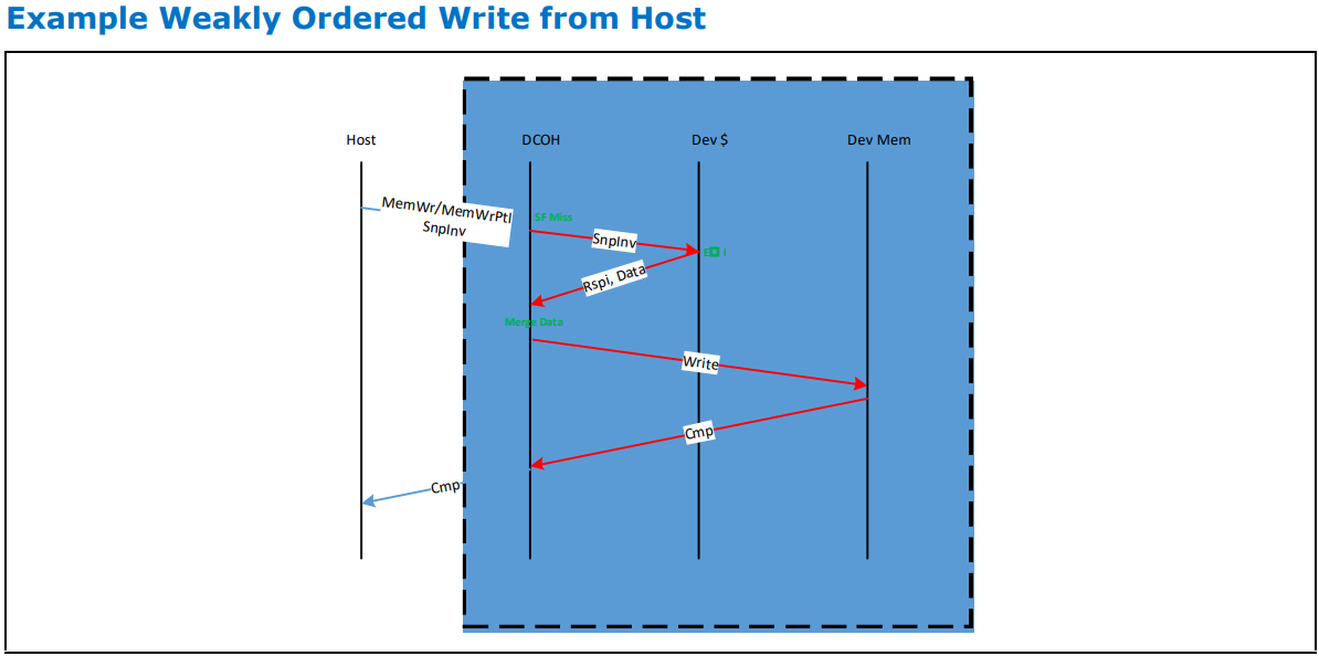 호스트가 부분적 또는 전체 라인의 weakly ordered 쓰기를 수행하는 상황입니다. 임베디드 SnpInv를 통해 weakly ordered semantics를 전달합니다. 이 예에서는 장치가 라인의 사본을 캐시하고 있어 메모리에 쓰기 전에 장치 내에서 데이터를 병합합니다. 그런 다음 Cmp semantics를 통해 호스트에 이를 전달합니다.