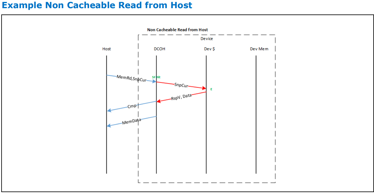 호스트가 (non-cacheable 라인의 사본을 요청하는 상황입니다. 요청은 "SnpCurr" semantics를 사용하여 캐시 불가능한 특성을 전달합니다. 이 예에서는 요청이 DCOH의 snoop 필터에서 히트를 발생시켜 장치 캐시가 snoop됩니다. 장치 캐시는 캐싱 상태를 변경할 필요가 없지만, 현재 데이터의 스냅샷을 제공합니다. 호스트는 Cmp semantics를 통해 라인이 캐시될 수 없음을 전달받습니다.
