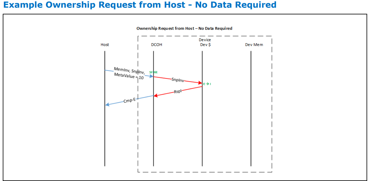 호스트가 장치에 데이터를 보내지 않고 라인에 대한 독점적 접근을 요청하는 상황입니다. 이는 MemInv opcode와 MetaValue '10 (Any)'를 사용하여 장치에 전달됩니다. 이와 함께 장치는 SnpInv 명령을 통해 캐시를 무효화하도록 요청받습니다. 장치는 캐시를 무효화하고 Cmp-E semantics를 통해 호스트에게 독점적 소유권을 부여합니다.