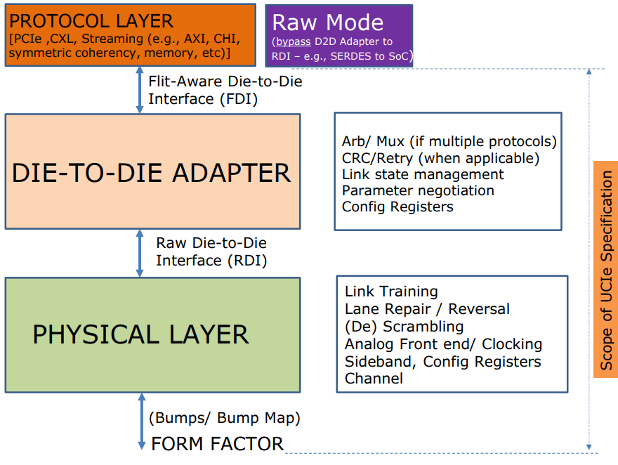 - Data link 및 Transaction Layer: PCIe의 data link layer와 transaction layer는 UCIe의 die-to-die adapter layer및 protocol layer를 통해 매핑됩니다. 즉, die-to-die adapter에서 PCIe의 data link및 transaction layer에서 필요한 기능을 수행합니다.