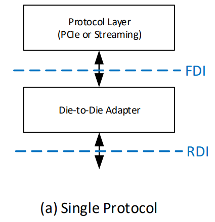 - 이 구성에서는 하나의 protocol 계층만을 사용하는 단순한 구조. 이 경우, FDI를 통해 protocol layer가 Die-to-Die adapter에 연결되고, RDI를 통해 physical layer에 연결됩니다.