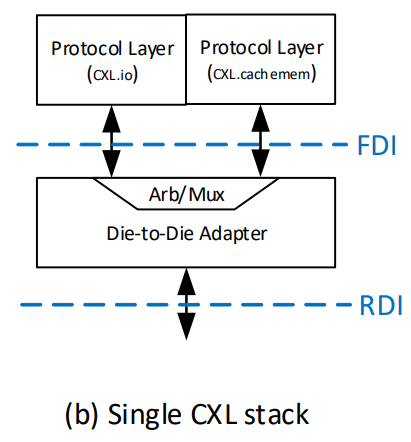- CXL protocol 계층이 하나의 adapter에 다중화되어 연결된 구조. Arb/Mux 기능을 통해 두 protocol layer에서 나오는 data를 조정하여 adapter로 전송됩니다.