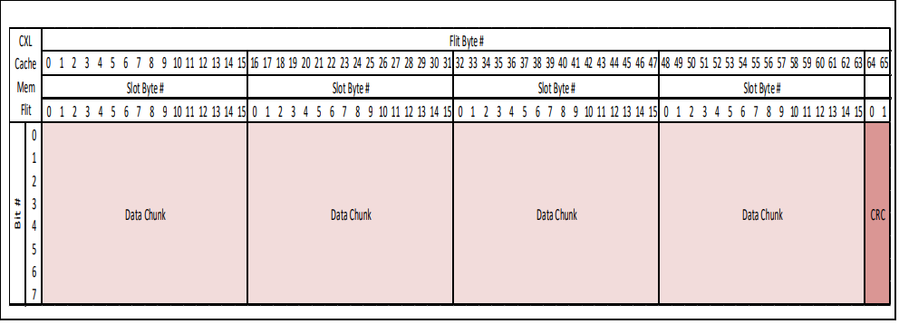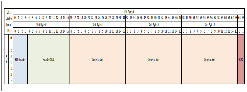 앞서 말한 3가지 flit은 모두 flit header(optional) slot 4개 + CRC로 구성되어 있으며, link layer에서 최종적으로 생성되는 flit의 크기는 66byte입니다. 흔히 CXL에서 flit의 크기는 68byte (CXL3.0에서는 256B도 지원합니다.) 라고 알려져 있습니다. 여기서 중요한 점은 CXL link layer에서는 66byte 크기의 flit이 만들어지면 나머지 2byte는 physical layer에서 생성된다는 점입니다.