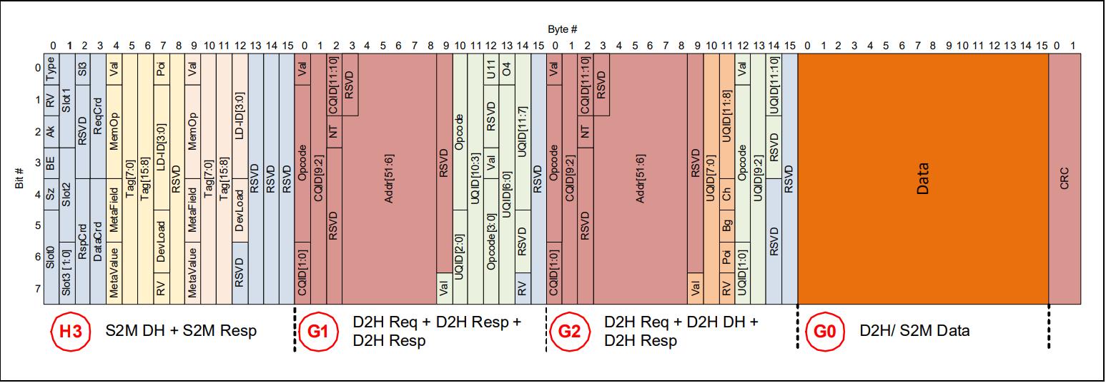 slot에는 여러가지 유형으로 나누어져 있습니다. 먼저 protocol flit의 경우에는 slot 0에는 Header slot을 사용해야되며, 나머지 slot 1~3까지는 general slot을 사용해야합니다. header slot과 general slot에도 여러가지 유형들로 나누어져 있으며, 각 유형별로 담을 수 있는 메세지가 다릅니다. 즉, 주어진 input에 따라 packing 알고리즘은 어떤 타입의 slot을 사용해야될지 결정해야합니다. 이러한 관점에서 최적화와 관련된 성능 차이가 크게 나타나며, CXL에서 packing 알고리즘이 중요한 이유 중 하나입니다. (일례로 intel에 발간한 CXL 소개 자료 중, futre work 중 하나가 더 나은 packing 알고리즘입니다.) 각 slot이 어떻게 구성되는지는 본 글에서 다루지 않을 예정이며, 자세한 사항은 스펙에서 쉽게 확인할 수 있을 것입니다.