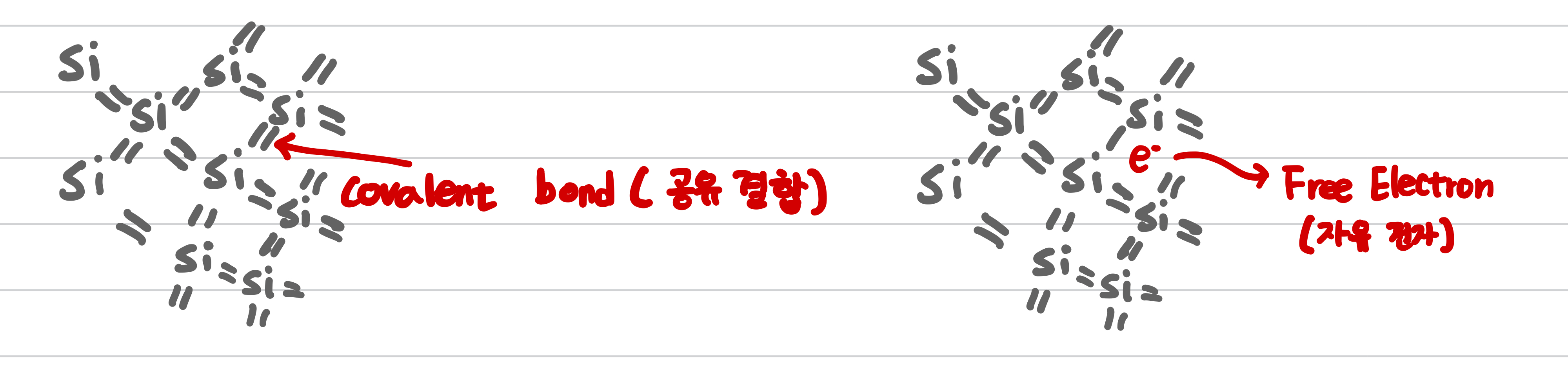 절대온도 0K에서 원자가 전자들이 공유결합에 구속되어 자유롭게 이동하지 못합니다. 즉, 절대온도 0도 부근에서 부도체로 동작합니다. 그러나 높은 온도에서 전자는 열에너지를 흡수하고, 공유결합을 깨뜨려서 또 다른 불완전한 결합을 이를때까지 자유전하 캐리어로 동작합니다.