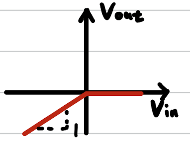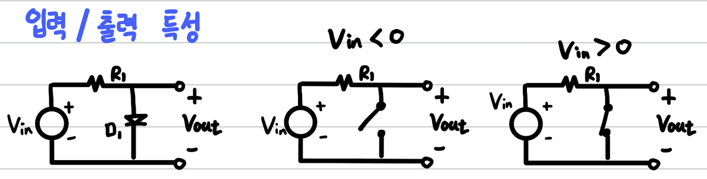 V(in) < 0 에 대하여 D1은 꺼진 상태를 유지하고 V(out) = V(in)이 된다. V(in) > 0 에 대하여 D1은 단락 회로로 동작하고 V(out) = 0 이된다. (출력이 0 이상 되지 않는다. )
