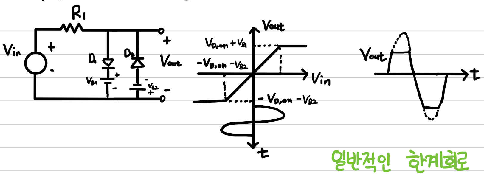 위와 같이 입력에 가해지는 신호는 +-V(L)에 잘려진 피크값을 가지고 출력에 나타난다. 이를 바탕으로 회로를 구현하면 V(in)이 +-V(L)에 접근함으로써 다이오드가 꺼져야 한다.