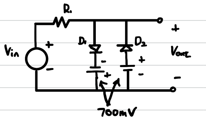 위와 같이 V(L) = V(B1) + V(D,on)에서 제한 된다. 두번째로 V(in)의 음수값 또한 제한 해야한다. 위의 회로부터 D1의 에노드와 캐소드가 바뀌면 회로는 V(in) = -V(D,on)에서 제한된다. 그러므로 밑의 그림과 같이 역팽형 다이오드가 +-V(D,on)에서 제한하는 특성을 만들어 낼 수 있다.